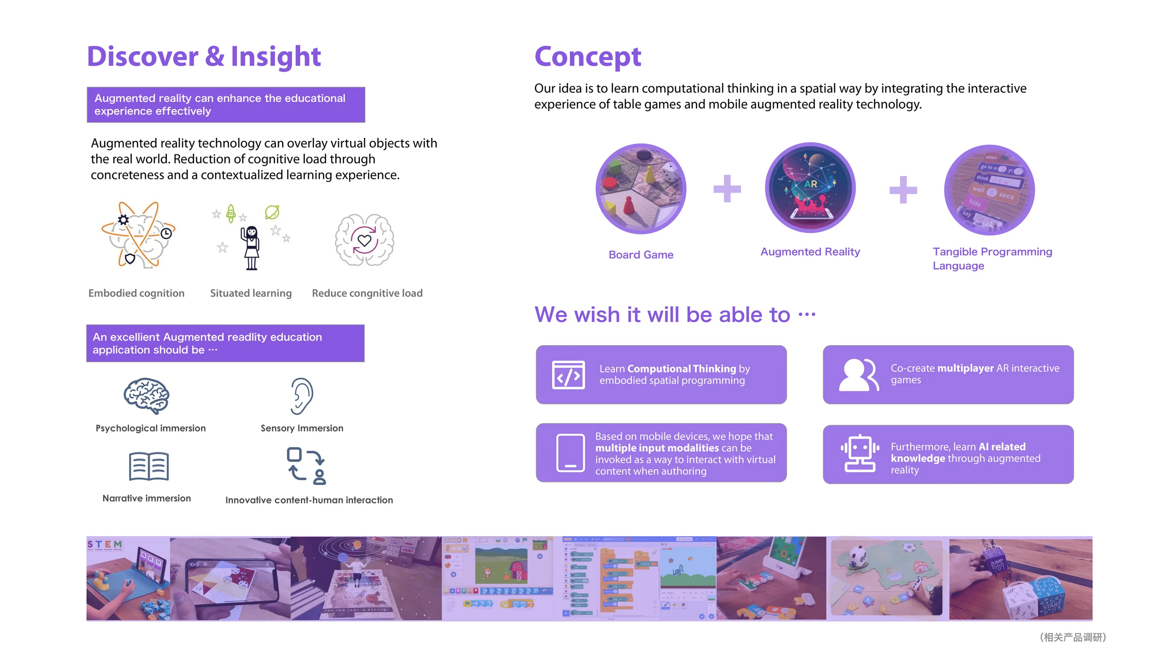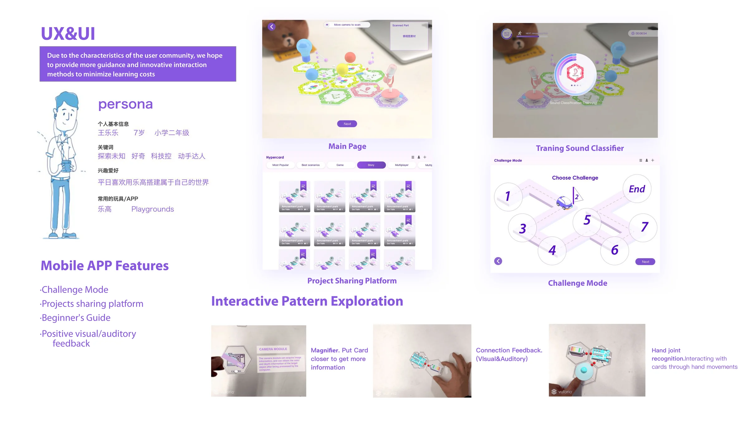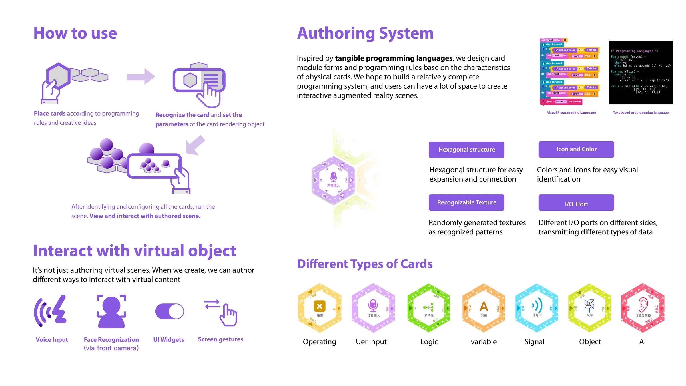 Hypercard 是一个实体编程教育系统,融合桌游、增强现实与实体编程语言,以空间化、具身化的方式 教授计算思维。儿童在桌面上放置六边形编程卡片,移动端应用识别并配置每张卡片后,在其上方渲染 交互式 AR 场景。系统支持多种输入模态(语音、人脸识别、屏幕手势、UI 组件)以及七类卡片 (操作、用户输入、逻辑、变量、信号、对象、AI)。基于 Unity 和 Vuforia 开发,原型演示了 语音控灯、多人 AR 高尔夫、表情控天气、编程挑战关卡等场景。
