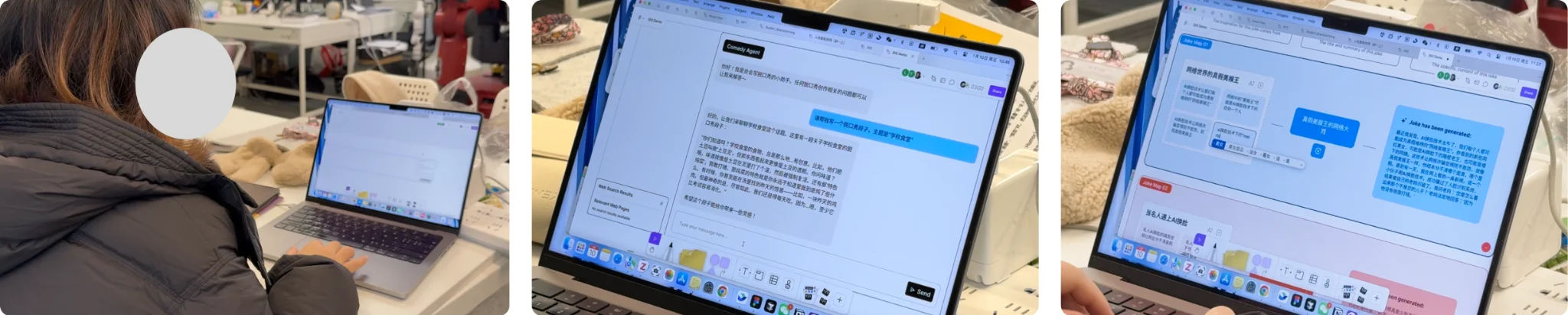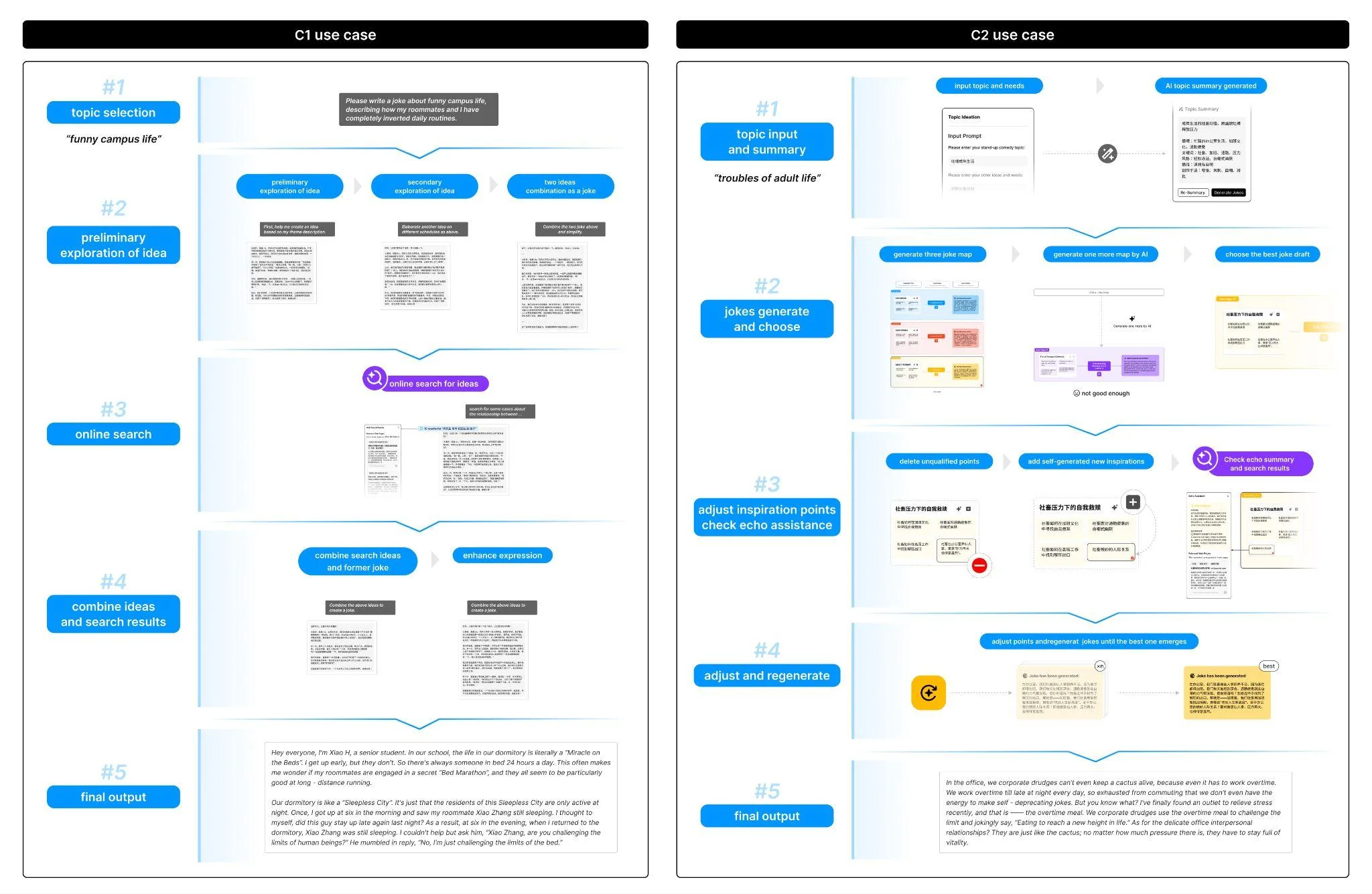 Most participants (13/18) favoured Jokeasy over the baseline. They described its four-stage workflow as “organised and sequential from inspiration to the final product” and felt it “integrated several small functions involved in joke writing.” Fourteen participants praised the canvas for its structured clarity, comparing it to a mind map. Integrated search helped users “continuously spark new ideas” and “trace back why the AI generated this inspiration.”